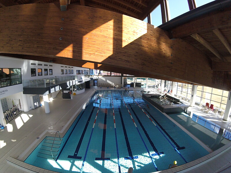 Un moderno centro acquatico, dove nuotatori, principianti, bambini e adulti possono nuotare e passare delle ore di relax e tanto divertimento. Vasca 25 metri, 5 corsie, profondità 1.20mt - 1.80 mt, acqua 28°C - 5 vasche idromassaggio di cui una con collegamento verso l’esterno: altezza 1.20mt, acqua 32 ° C (quella esterna è più calda). 1 scivolo lunghezza 81 mt con arrivo in un corridoio con l’acqua 20 cm che frena la scivolata - 1 vasca didattica altezza 90 cm acqua 31°C - 1 vasca fitness altezza 1.20 mt acqua 31°C - 1 vasca per bambini altezza 40 cm acqua a 31°C
