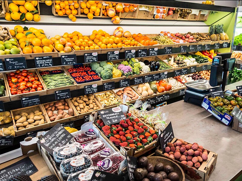 Grande varietà di frutta e verdura fresca e prodotti regionali