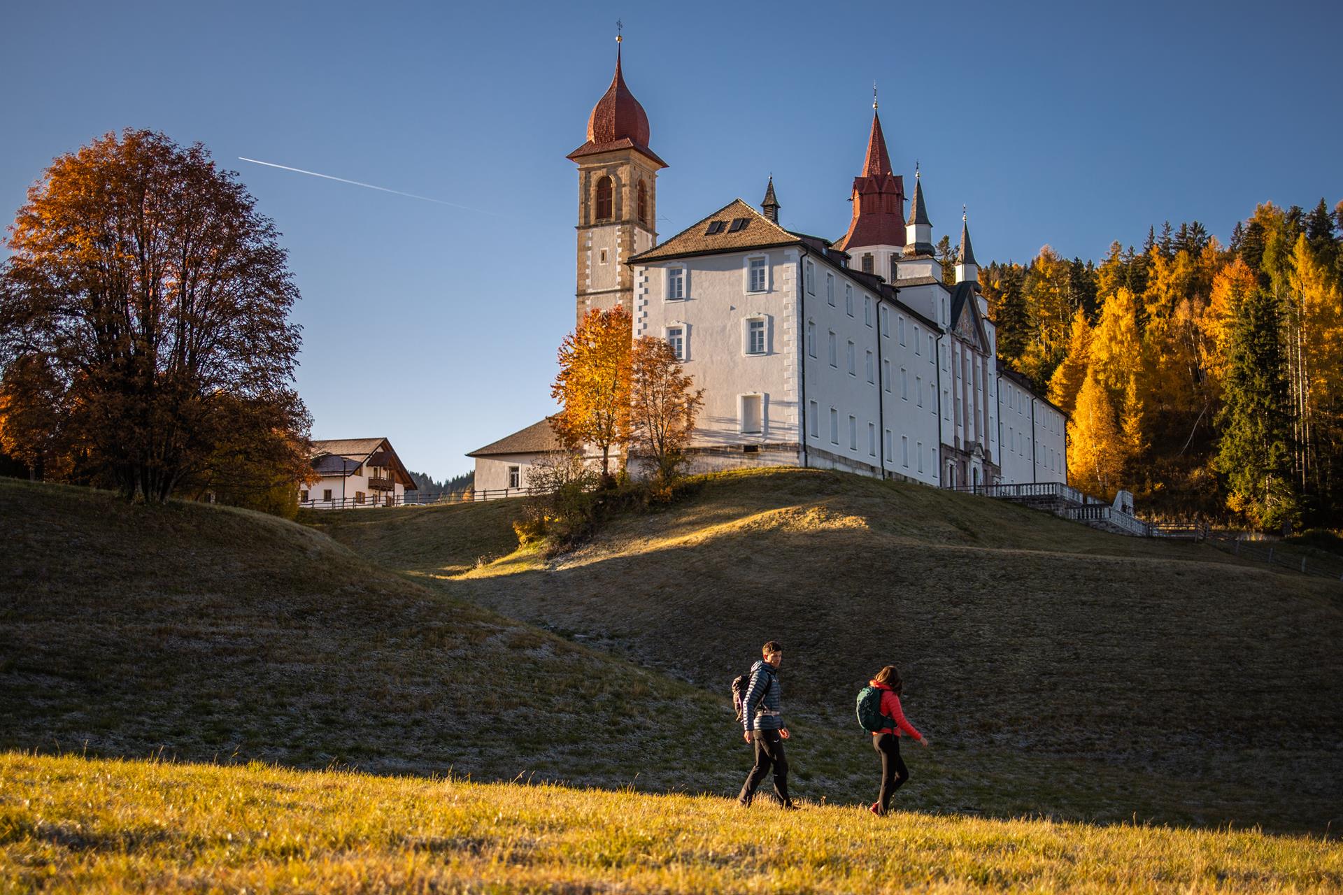 Suggestiva escursione attraverso le malghe di Aldino fino al santuario di Maria Pietralba, con splendide vedute sul sud dell’Alto Adige.