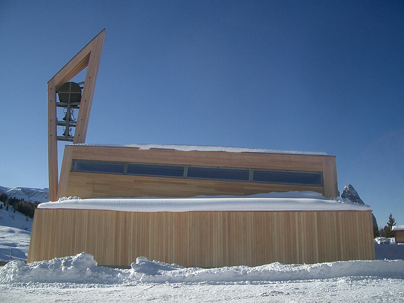 La chiesa di San Francesco all’Alpe di Siusi, a forma di colomba stilizzata, invita i visitatori al raccoglimento e alla meditazione. La chiesa che sorge in un luogo molto particolare è dedicata a S. Francesco d'Assisi, il santo patrono dell'ambiente, della natura e degli animali. La pianta dell’edificio richiama la figura di una colomba, il cui corpo è dato dalla costruzione centrale, le ali dai fabbricati laterali e il capo dal campanile che, grazie alla struttura in legno lamellare, sorge dalla costruzione centrale senza soluzione di continuità. L’interno, spazioso e ben organizzato, presenta un interessante gioco di luci ed ombre. Il coro, leggermente rialzato, secondo l’antica tradizione, è rivolto verso est. Per la costruzione sono stati preferiti materiali semplici di provenienza locale, come il porfido e il legno di larice, il cui delicato profumo crea un’atmosfera piacevole e accogliente.