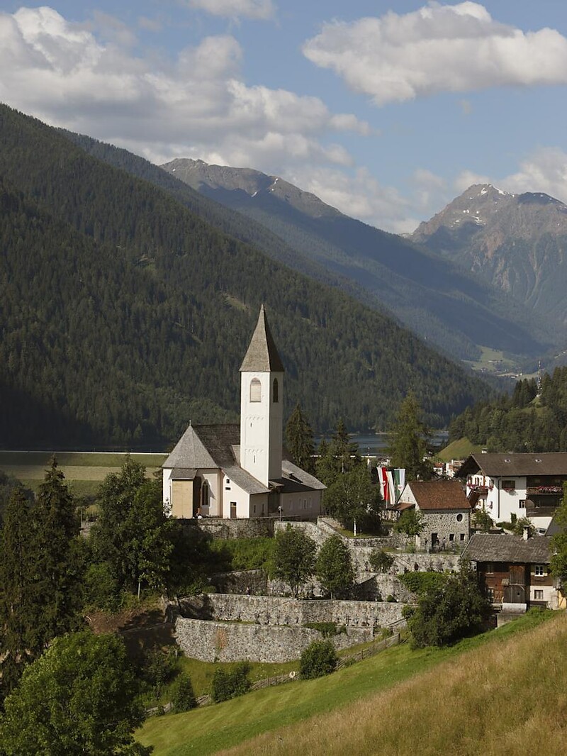 Arrivo da nord-ovest attraverso il Passo Resia: Passo Resia - Val Venosta - MEBO in direzione Bolzano - uscita Merano Sud (zona industriale Lana) - Lana - Val d'Ultimo - S. Valburga- Chiesa parrocchiale s. Valburga