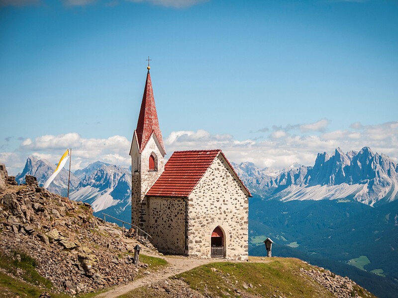 Negli ultimi secoli, il rifugio vicino alla chiesetta in quota (2.305 m d’altitudine) ha offerto protezione e riparo a numerosi pellegrini ed escursionisti. Innumerevoli e mirabili storie aleggiano su questo luogo benedetto, come ad esempio quella secondo cui all’inizio del 18° secolo il “Dio nero” avrebbe scelto con un cenno del capo il luogo in cui collocare il crocefisso. Ed è qui che si prega (soprattutto per la protezione dal maltempo) alla fine del pellegrinaggio moderatamente ripido, salendo dal Rifugio Chiusa in circa 1 ora.