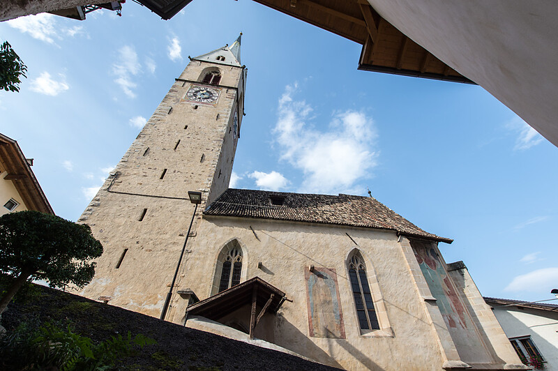Festa di patrocinio: 17 gennaio La parte più antica della chiesa del Duecento è visibile nel campanile e nella muratura della navata. Nel 1430 circa si aggiunse un coro poligonale gotico, che nel 1742 venne interamente coperto di affreschi dai due pittori bolzanini Berhard e Jakob. Essi eseguirono anche la monumentale figura del San Cristoforo sulla facciata meridionale.